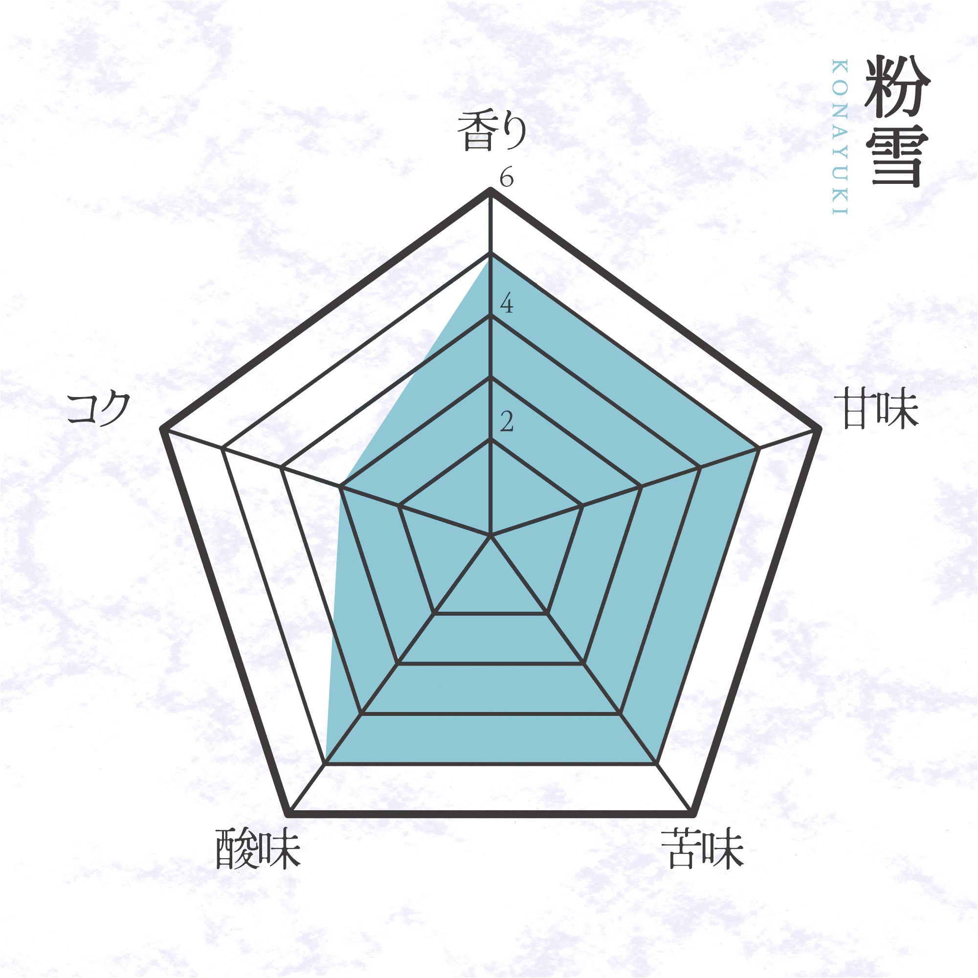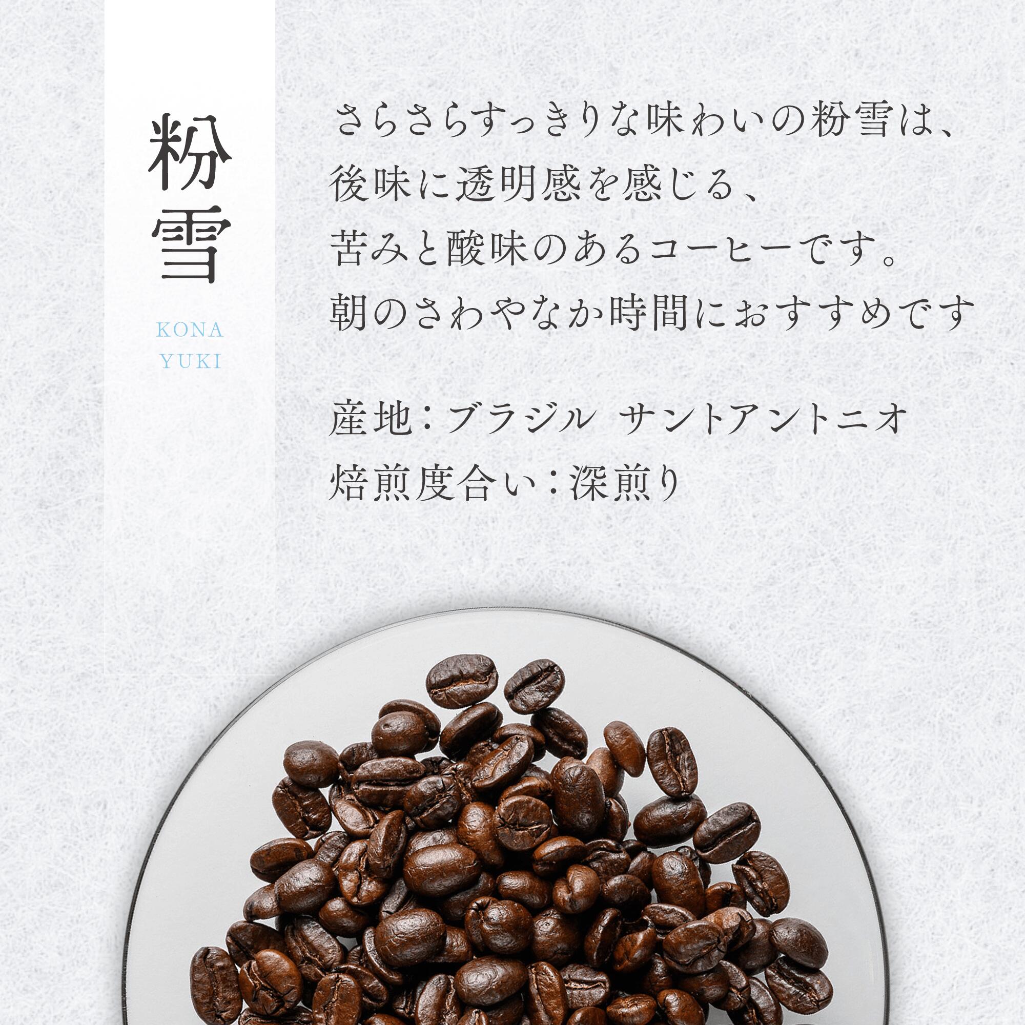 さらさらすっきりな味わいの粉雪は、後味に透明感を感じる、苦みと酸味のあるコーヒーです。朝のさわやなか時間におすすめです。