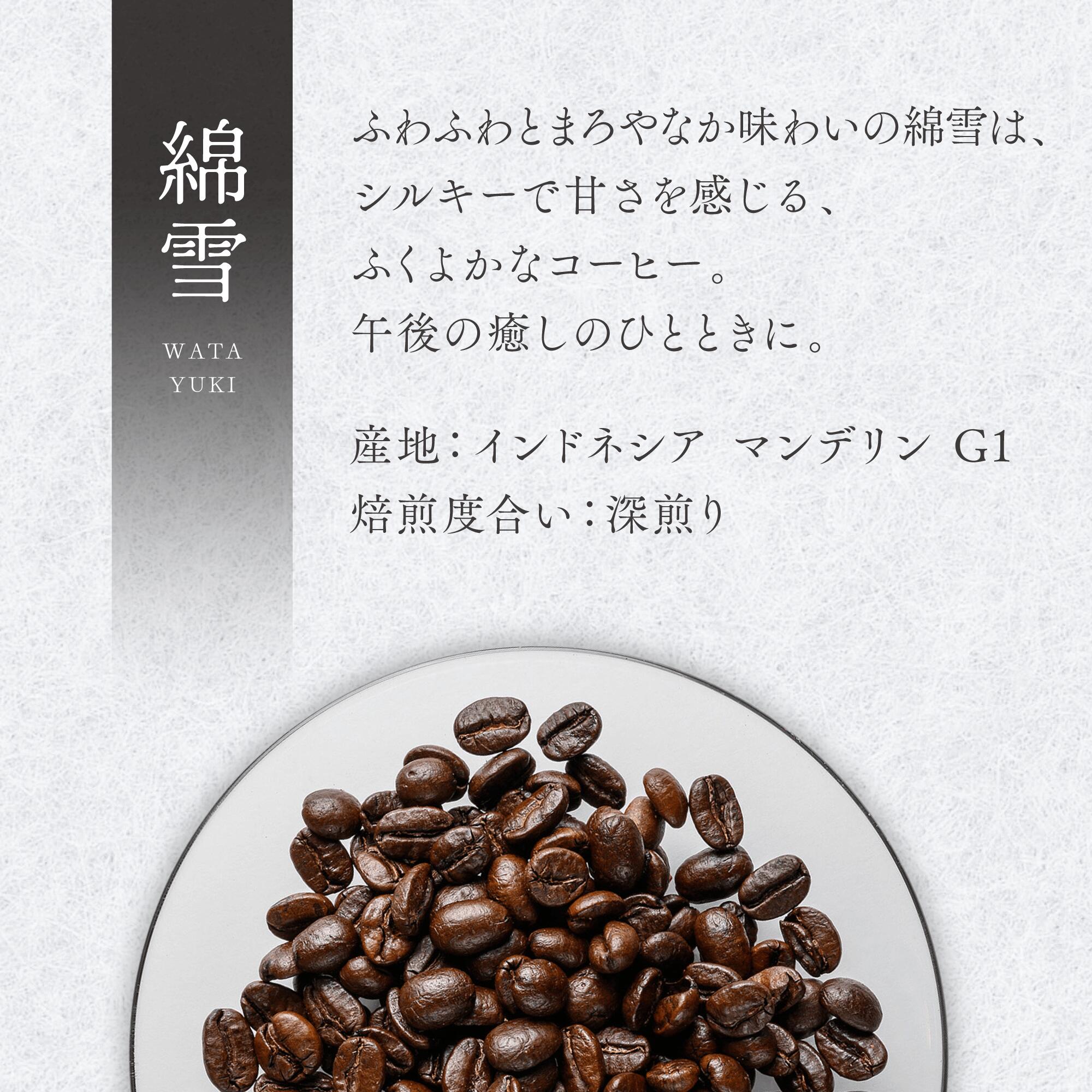 ふわふわとまろやなか味わいの綿雪は、シルキーで甘さを感じるふくよかなコーヒーです。午後の癒しのひとときに。