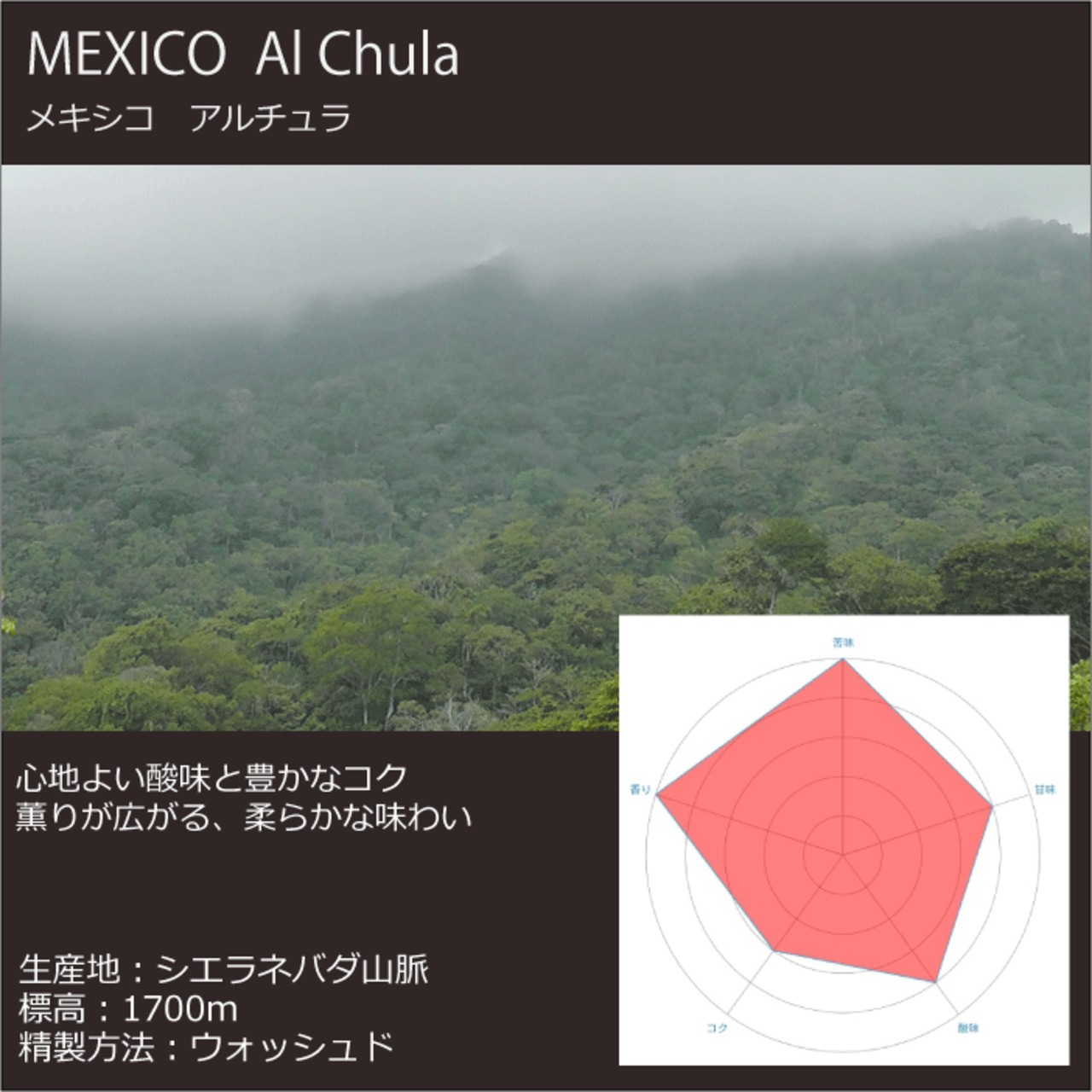 メキシコの高地で栽培されたコーヒー豆。豆本来の風味と、心地よい酸味と香り豊かなコクが特徴です。